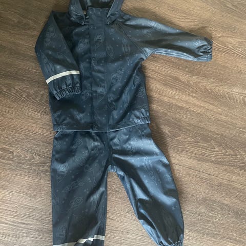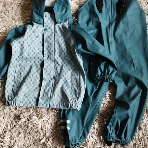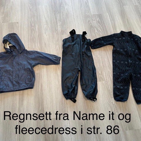 Regnjakke og regnbukse fra NameIt i størrelse 86 selges. Regntøyet er i lilla, og fremstår som pent brukt, uten noen synlige hull, flekker eller andre anmerkninger. Kommer fra et røyk- og dyrefritt hjem.