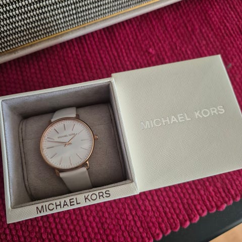 Selges en Michael Kors dame klokke, sølv farge, brukt lite, kan justeres bånden for å bli store( har ekstra del)