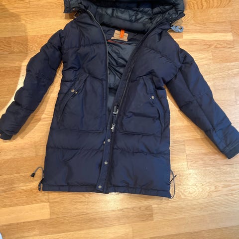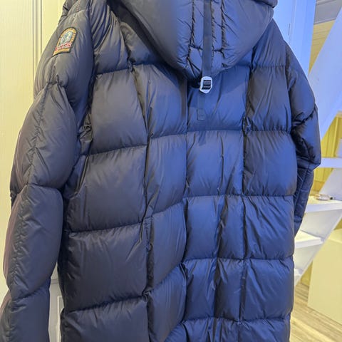 Jakken har en polstret, vattert design med hette og flere lommer. Materialet er laget for å gi varme og beskyttelse mot vær og vind.