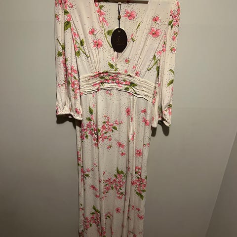 Nydelig lang kjole med lange ermer og løs passform. Blå underkjole. Glidelås i siden, knapp bak og nederst på ermene. Meget pent brukt en gang og nesten som ny.