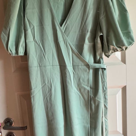 Gina Tricot Sommerkjole/Wrapdress i størrelse L, farge Lys grønn. Kjolen er laget av 64% viskose og 36% polyester. Den har et lett og luftig design med knyting i siden, og passer til sommerbruk.
