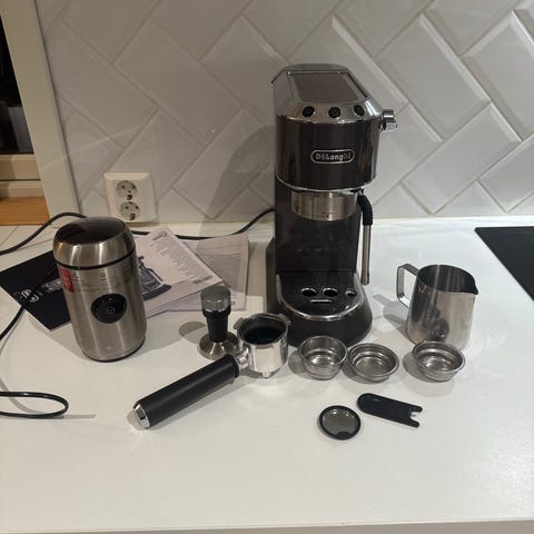 DeLonghi Dedica ES espresso maskin i beigefarge med kompakt design. Maskinen har en vanntank på baksiden, steamstav for melkeskumming, og medfølgende filterholdere og tamper. Passer til hjemmebruk for å lage espresso og melkebaserte kaffedrikker.