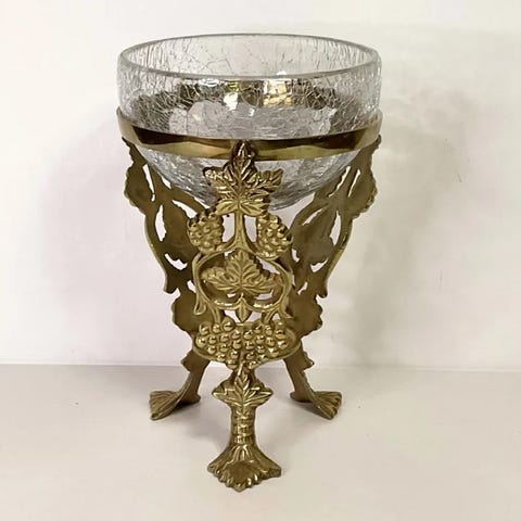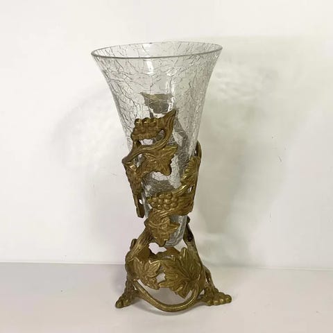 Vintage messingvaseholder i filigranstil med tre bein og kjegleformet glass.