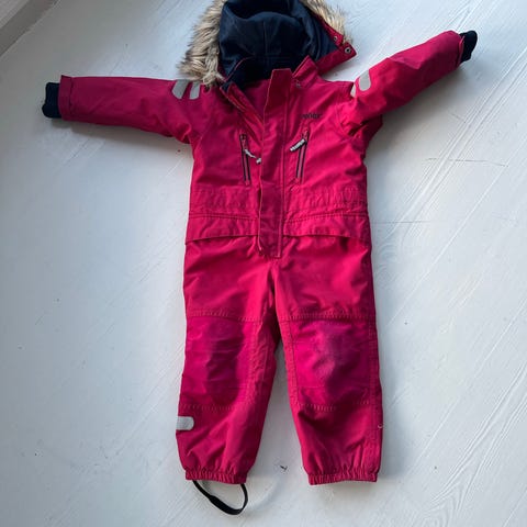 Reflex parkdress i størrelse 98 / 3 år. Den har hette, elastiske mansjetter ved armer og ben, og reflekser for økt synlighet. Det er et hull i stoffet på buksebenet som vises på bildene, og slitasje på stoffet rundt strikkene til føttene. Bør nok også impregneres før bruk. Brukt til to barn.
