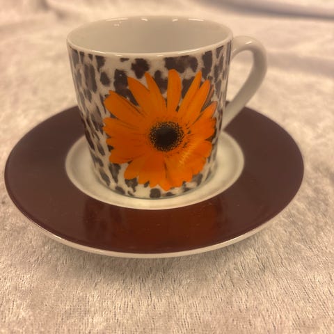 8 mokkakopper eller kaffekopper i pene farger med gullkant. Alle kopper har tilhørende skål. Koppene er i veldig god stand, men tallerknene har noen bruksmerker, som vist på bilde.