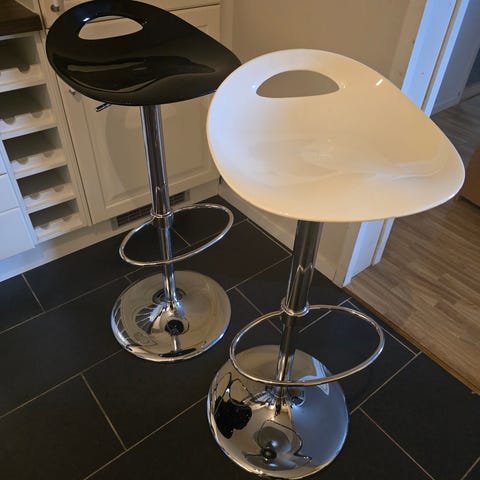 2 elfenbenshvite barstoler fra italienske Effezeta selges billig. Slitasje på setene. Kanskje et strøk Bengalack? Stødige og gode, og helt i orden. Regulerbar høyde.Hentes på Notodden. Pris for begge: 1000,-