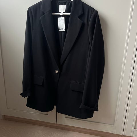 Zara blazer i svart farge, størrelse M for kvinner. Jakken har lang erm, klassisk krage og to lommer foran. Materialet er ikke spesifisert, men jakken har et rent og enkelt design som kan brukes til ulike anledninger.