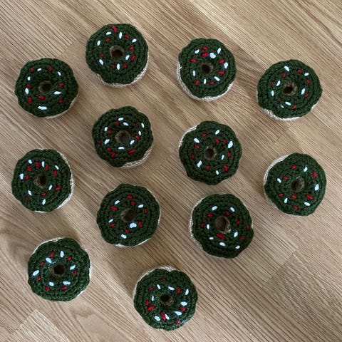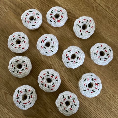 Rød heklet donut doughnut smultring sprinkles hvit grønn jul