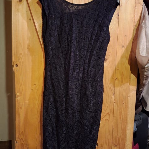 Saint Tropez Festkjole i svart fløyel med litt "bling" i stoffet, størrelse L. Kjolen har lange ermer og glidelåsdetalj bak. Materialet er mykt og behagelig, egnet for formelle anledninger.