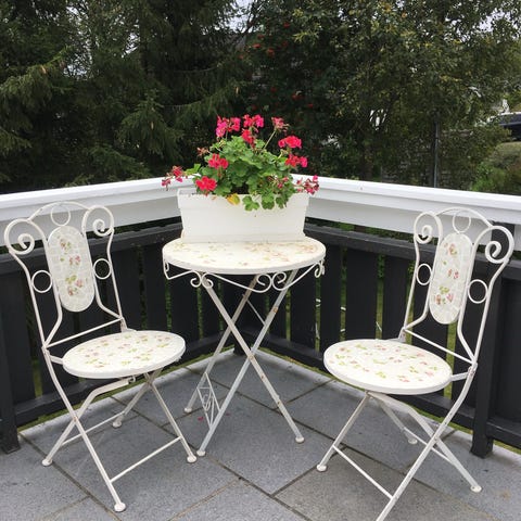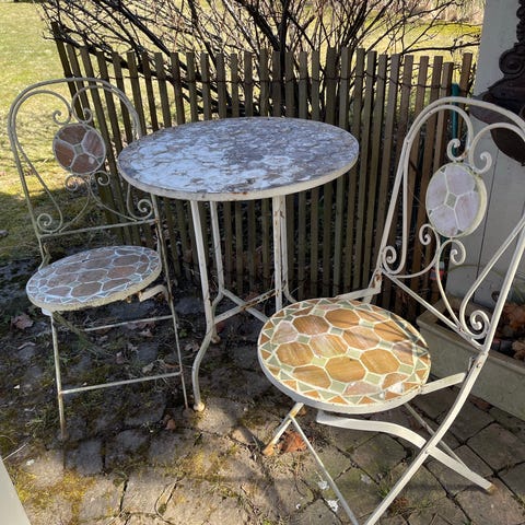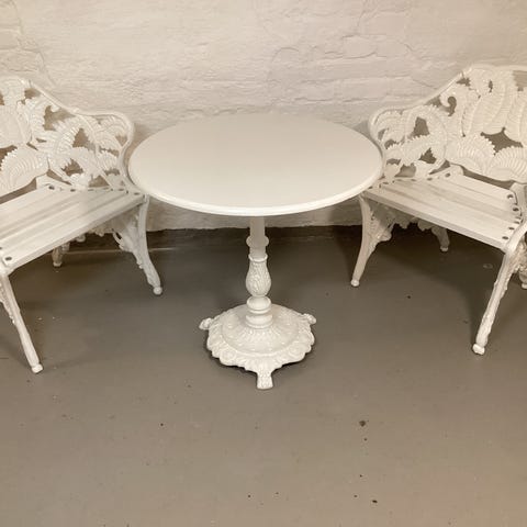 Nydelig vintage cafe-sett med fin patina. Smijern. To stoler, rundt bord og et lite rundt bord. Trolig fransk eller italiensk . Til hagen, balkongen eller vinterhagen.