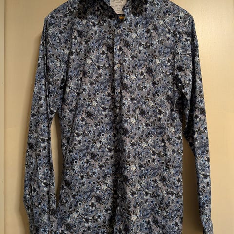 Stilig skjorte fra norske FRAM med småblomstret mønster i blått og hvitt.