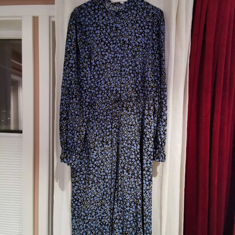 Kjole i flerfarget mønster, str Xl , passer 44-46. Kjolen har lange ermer med mansjetter og knapp , 2 lommer og belte
