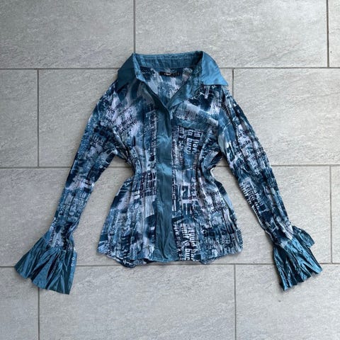 Elegant hvit retro skjorte med lys blå detaljer og gull knapper. Materialet er lett og ligger godt til kroppen. Skjorta er kjøpt brukt i Japan 2022.