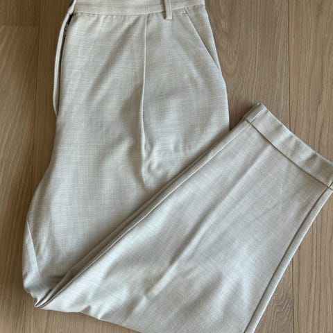 Five Units Emma Chinos. Farge moonbeam, størrelse 34. Laget av 97% bomull og 3% elastan, gir en komfortabel passform med litt stretch. Chinosene har knapp- og glidelåslukking, lommer foran og bak, og er velegnet til både fin og hverdags. Nyvasket.