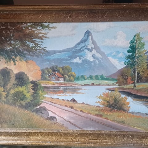 Flotte akvarellmaleri fra 1983 som viser et landskap. Maleriet er innrammet og har detaljer med naturmotiver som trær, vann og snødekte omgivelser. Signert av kunstneren.