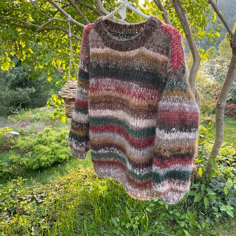 Jeg har en helt nystrikket genser til salgs. Den er strikket etter mønsteret Spot, og er en utrolig fin, god og myk genser. Den er strikket i tynn silk mohair fra Sandnes, Kidsilk fra Drops , tynn merino i ulike farger og Silky Wool fra Camilla Pihl. Sammensetningen gir en kjempemyk og lett genser.