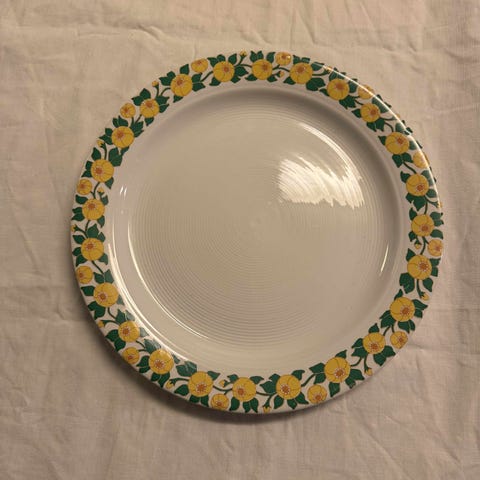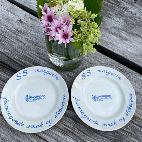 Tallerkener og serveringsfat fra Egersund Fayancefabrikk er populære blant samlere. Servise bestående av flere tallerkener og dype tallerkener i keramikk. Tallerkenene har en beige farge med en rød/brun kant rundt.