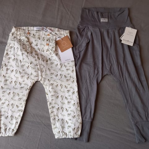 Selger tre myke og gode bukser i størrelse 68. Buksene er pent brukt, den eneste anmerkningen jeg kan finne er at lommen på den ene buksen har løsnet såvidt øverst i det ene hjørnet. Kan fint syes på igjen, jeg har ikke gjort noe med det selv. Buksene er fra Lindex, Pippi og Fixoni.