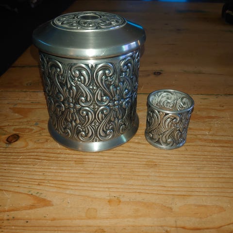 Retro hamret tobakkskrukke i Tinn. Norsk produsert av IK Tinn A/S Oslo.