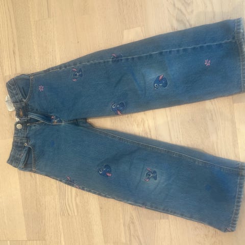 Svarte jeans med Stitch, størrelse 156, brukt én gang. Jeans, pris: 250 nok.