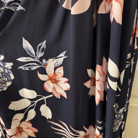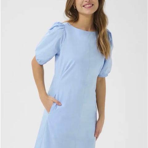 Kjole med rund hals og korte puffy ermer. Innsnitt ved brystet. Glidelås i ryggen. Sømløse kanter nederst på kjolen.