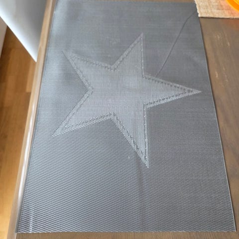 3 stk. spisebrikker i størrelse 30x50 cm. Materialet er polyester med en teksturert overflate i fargene rød (2stk.) og grå 1stk.). Selges samlet.