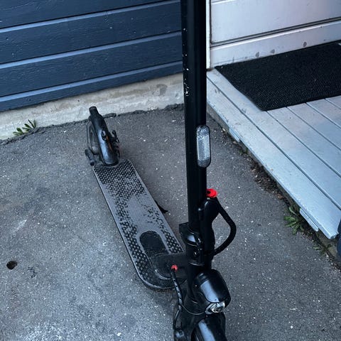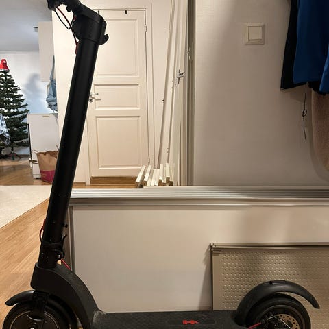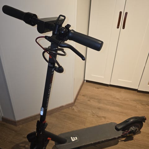 E-Wheels EV2 elektrisk sparkesykkel i svart farge. Utstyrt med sammenleggbar ramme for enkel transport og oppbevaring. Har et bredt ståbrett for god stabilitet. Leveres med lader for opplading av batteriet. Egnet for daglig pendling og kortere turer.