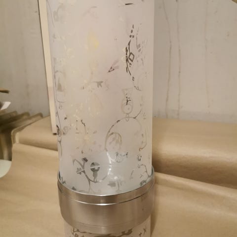 Lykten består av 3 deler som settes i hverandre, to deler av frostet glass med eventyraktig mønster, og en del i rustfritt stål, som er lysholderen. Se bilder.