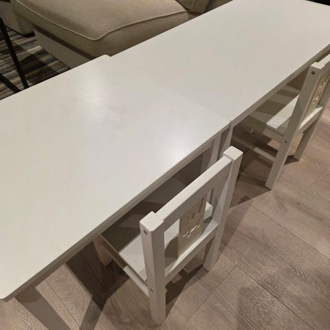 Bordet er godt tatt vare på og i veldig fin stand. Det har en hvit bordplate med tre svarte glassfelt i midten, som gir et elegant og moderne uttrykk.