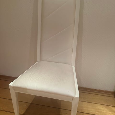 Et par av trekkene har noen små merker, som også kan sees på bildene. Ikke forsøkt å fjerne disse. Treverket på stolene har også litt riper i lakken som fint kan fikses.