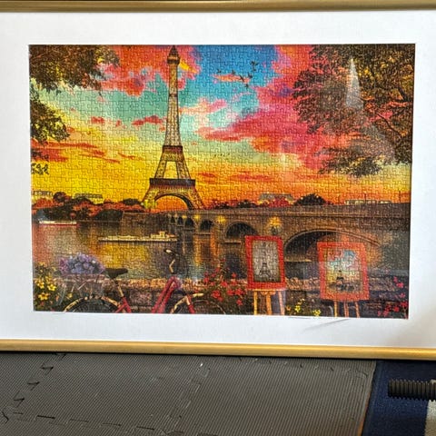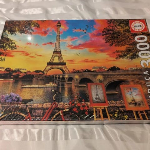 Castorland Sunset in Paris puslespill med 3000 brikker. Motiv av solnedgang i Paris med Eiffeltårnet. Puslespillet har dimensjoner på 120 x 85 cm når det er ferdiglagt.