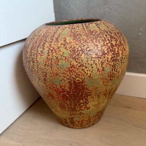 Vase/potte i keramikk med turkis/sjøgrønn kant. Kan også brukes som kopp til penner/pensler e.l. Se bilder for mål.