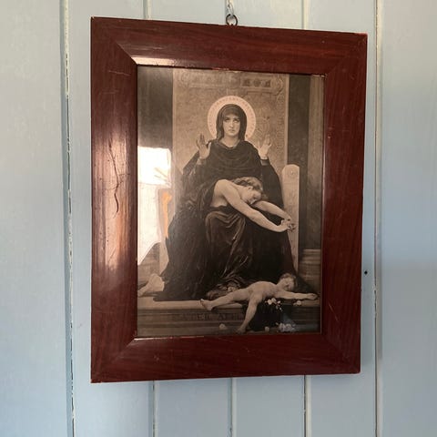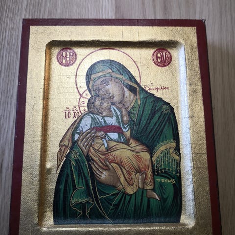 Ikon maleri som forestiller Madonna med Barn, malt på treplate. Maleriet viser religiøs kunst med detaljer i farger som rødt, blått og gull. Treplaten har synlige tegn på alder og bruk, med noe slitasje på kantene. Passer til dekorasjon eller samling av religiøse kunstobjekter.