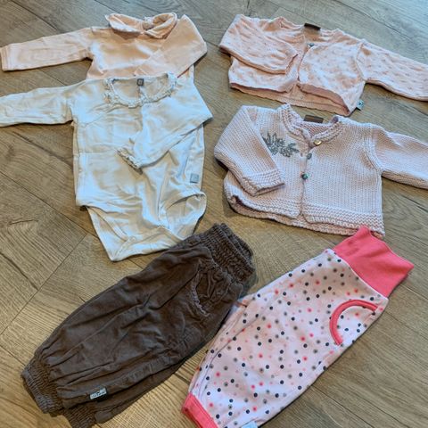 Ull i størrelse 62, flerfarget. Inkluderer ulike plagg som heldresser og gensere i forskjellige farger og mønstre.