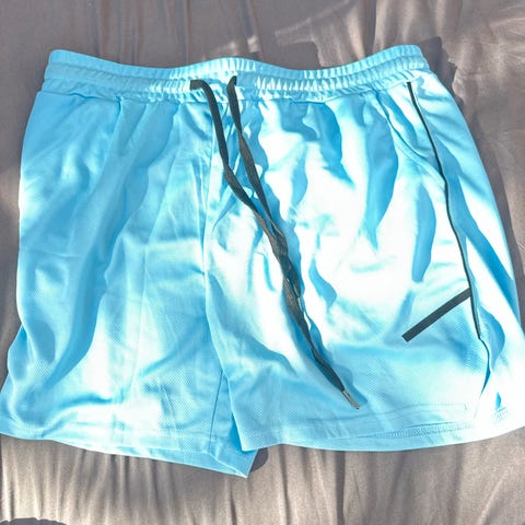 Jordan basketballshorts for barn i størrelse 128. Shortsen har et mønster i turkis og hvitt, og er laget i lett materiale egnet for sport og fritid.