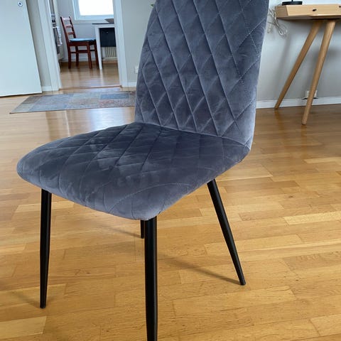 4 koksgrå fløyel stoler med svarte ben.
