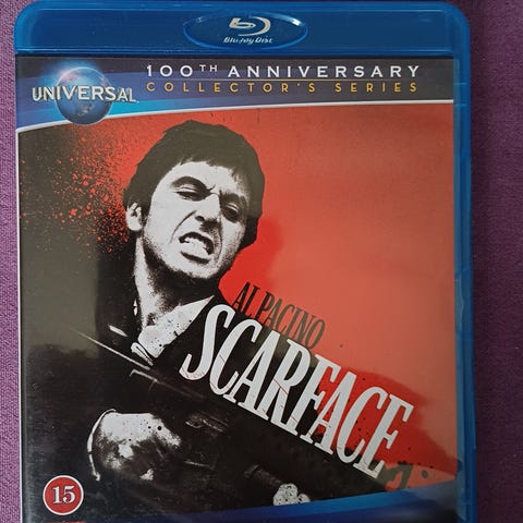 Scarface Blu-ray Universal Film med 15-års aldersgrense. Inkluderer jubileumsutgave med ekstra innhold. Formatene inkluderer Blu-ray og DVD.
