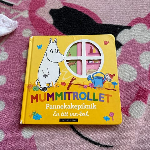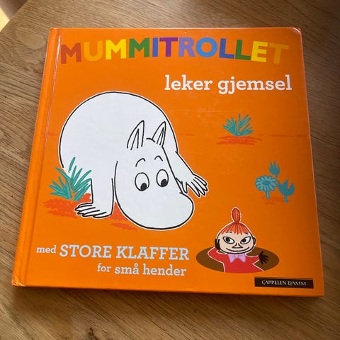 Mummitrollet leker gjemsel. Slitasje i perm. En klaff teipet men ellers alle klaffene der.