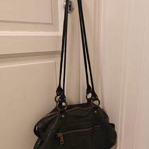 Praktisk skinnveske fra Tiger of Sweden 😍 Den har kort og lang hank som kan festes på to plasser. Den korte er ødelagt, men kan fortsatt brukes eller fikses 👌🏻 Se bilde! Eller man kan la være å ha den på og ha kun den lange ☺️ utvendig lomme og innvendig lomme med glidelås og mobillomme.