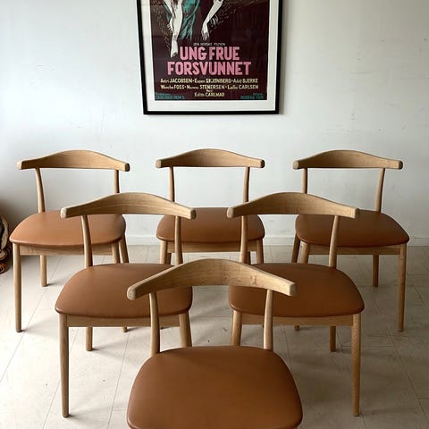 6 herlige retro renoverte spisestuestoler selges. Stolene er pusset ned, såpevasket, fått ny stopping og trukket om i nydelig italiensk skinn. Stolene fremkommer som meget pente. Selges kun samlet.