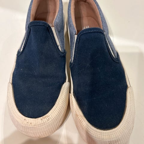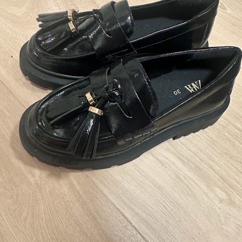 Pent brukte mørkeblå mokkasiner selges fra Zara