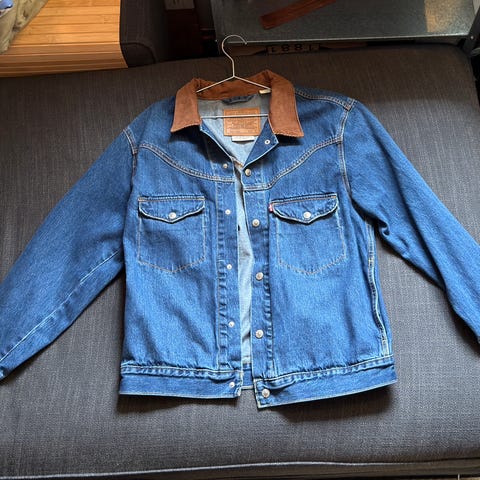 Superfin jakke i denim fra Nudie Jeans. Foret med ull og med krage i kordfløyel. Jakken lages ikke lenger, og var Nudies versjon av Lee Storm Rider jakken. Nypris var 2500. Lite brukt og helt strøken.