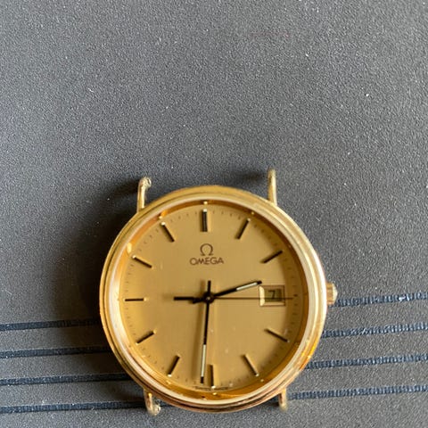 Omega De Ville gullklokke med brun skinnrem. Klokken har en hvit urskive med romertall som timeindikatorer og datoindikator ved klokken 3. Urverket er mekanisk med analog visning. Et herreur,