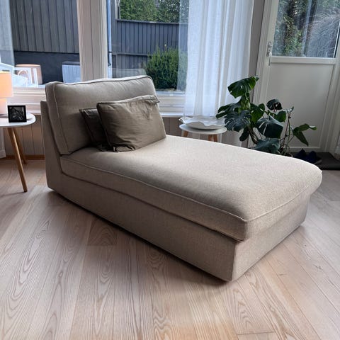 Selger en lite brukt elegant hvit sjeselong som har vært på et gjesterom og har hatt pledd over seg da det ingenting på den også den støvsuget og vasket. Er veldig nøye på alt er pent.