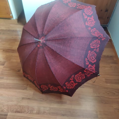 Den ene ribben/spilen er ødelagt. Mangler tuppen på toppen av paraplyen. Stoffet er ikke lenger ensfarget.
