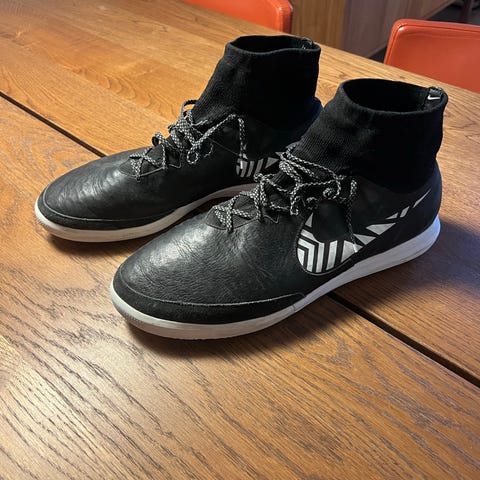 Nike fotballsko i størrelse 42, designet for innendørs bruk. Skoene har en grå og oransje fargekombinasjon, med en høy ankelmansjett for ekstra støtte. Materialet er tilpasset for fotballspill og gir godt grep på innendørs underlag.