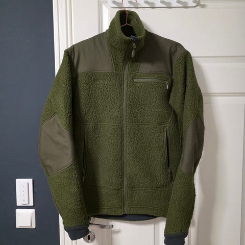 Norrøna Finnskogen jakke str. L, i svært god stand, men den ene hempa for radioantenne løsnet i sømmen. Enkel fiks med et par sting eller lim.