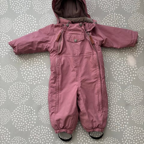 Polarn O. Pyret vinterdress i størrelse 56, designet for jenter. Dressen er rosa og har en foret innside for ekstra varme. Den har hette og glidelåser foran for enkel på- og avkledning. Egnet for små barn i kalde værforhold.