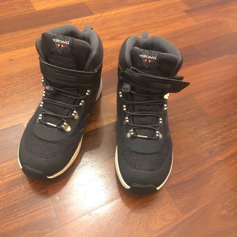 Viking barnesko i størrelse 34, unisex. Skoene er grønne med hvit såle og har borrelås og elastiske lisser for enkel tilpasning. Egnet for barn og designet for komfort og funksjonalitet. Goretex. Vanntett. Perfekt tak l vinter