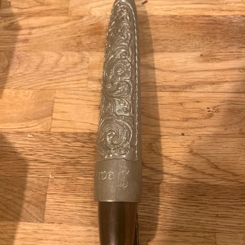 Blad: Karbonstål, ca. 105 mm – lett å slipe, husk å tørke og olje for å unngå rust